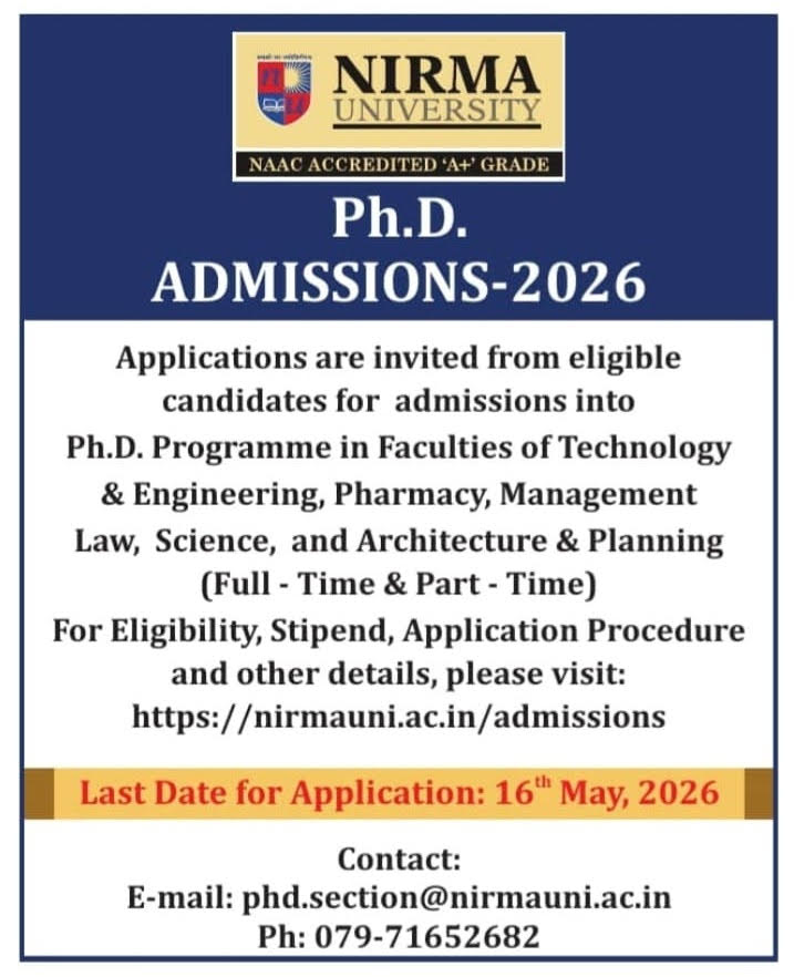 The candidates are required to take an entrance test conducted by Nirma University. The Entrance Test will be conducted at Nirma University tentatively in the last week of July – 2026.